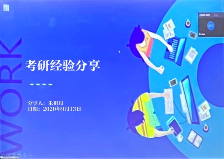 之后分享经验的是毕业于16级环科专业,考研成功的朱祖月。朱祖月首先介绍了研究生入学考试初试的基本情况,介绍了初试的考试科目与复习流程,分享了自己的复习经验与计划。她强调了考研复试的三大能力:专业基础,英语口语能力和临场应变能力并建议同学们从大一开始尽早锻炼。最后朱祖月好建议同学们要优先考虑保研,要重视绩点。