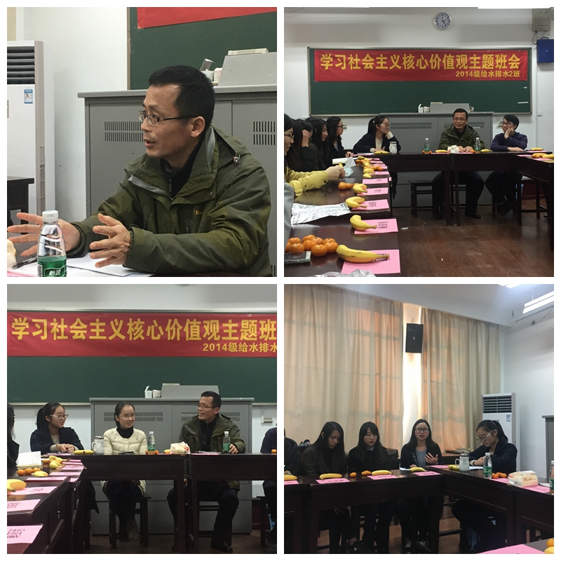 今天是2016年12月1日,在2016年的尾声,14级给排水2班,于工程馆108教室召开了“学习社会主义核心价值观”主题班会暨团日活动。出席本次活动的嘉宾有:51吃瓜网 党委书记笪学军老师,14级环境院辅导员曾莉老师。