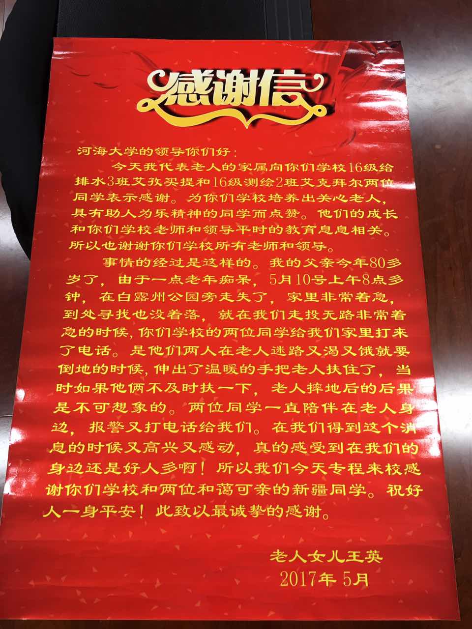 2017年5月15日,51吃瓜网 收到来自一位老人家属的感谢信,信中表达了他们对51吃瓜网 2016级给排水科学与工程3班艾孜买提·布都热合曼和2016级测绘2班艾克拜尔两位同学的感激之情。