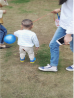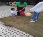 我们班的女生把吹好的气球用准备好的细线绑上送给可爱的小宝宝们,并结合刚刚过去的“世界环境日”向小朋友们宣讲了一些简单的环保知识,同时也吸引了小孩子的爷爷奶奶们也走进了我们的中间。