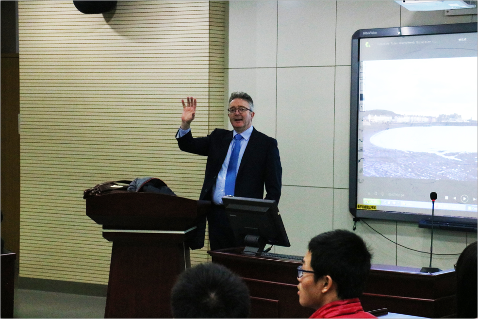宣讲会开始前,John Grattan教授先给同学们展示了一小段介绍亚伯大学的视频。亚伯大学位于英国威尔士,大学分三个校区,依山傍海而建,有着英国其他大学无法比拟的独特地理优势。同时学生可独享全英第二的威尔士国家图书馆,是绝佳的学习胜地。杰出的研究教学质量、广泛的专业设置、一流的教学及体育设施以及优越的地理位置都是亚伯大学的特色。