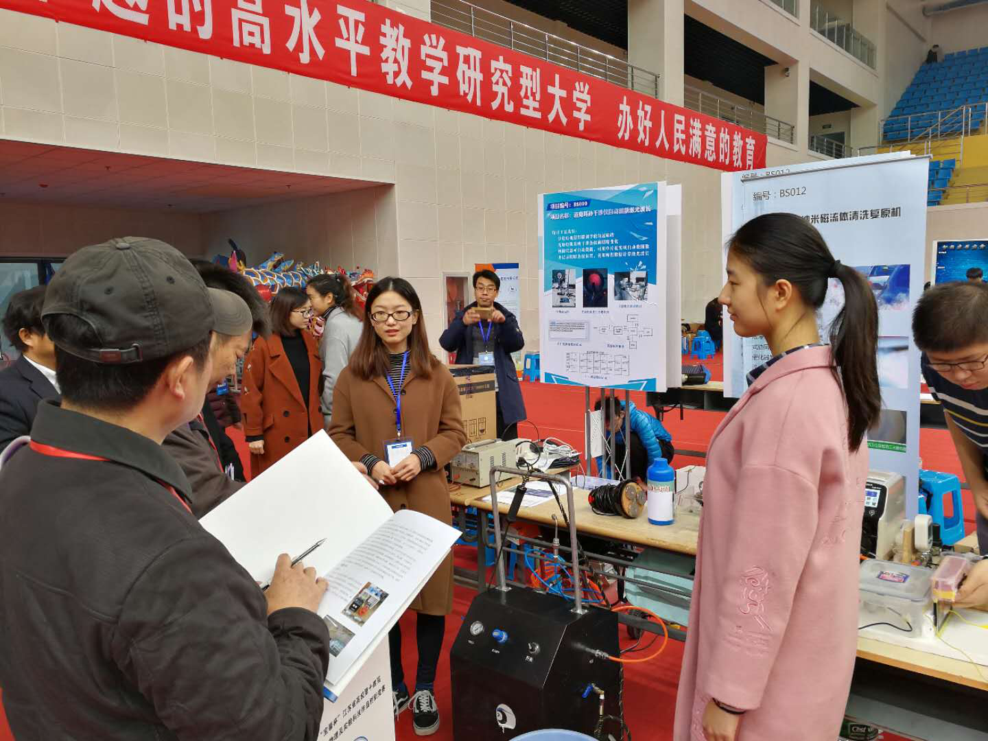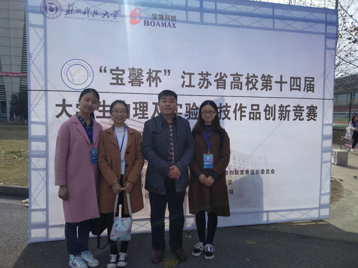 2017年11月25-26日,江苏省高校第十四届大学生物理及实验科技作品创新竞赛在苏州科技大学隆重举行。51吃瓜网 51吃瓜网 2015级学生高惠子、朱莹、崔贺宁组成的小组在51吃瓜网 周晓峰老师的指导下代表51吃瓜网 参加实验科技作品的比赛,经过紧张的备赛,作品《三元催化磁流体清洗复原机》荣获一等奖,《引霾入污空间雾霾疏导净化系统装置》荣获三等奖。