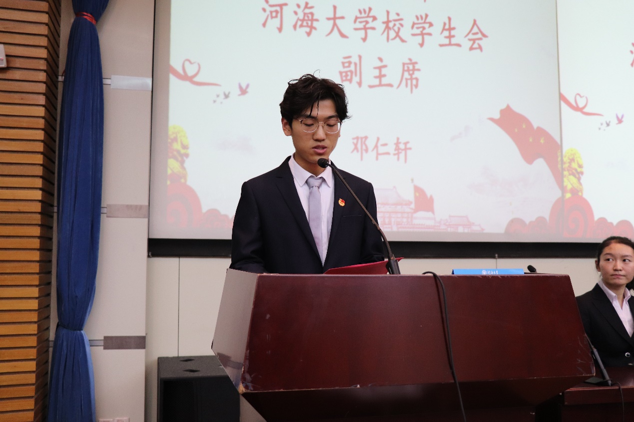 在接下来的学生代表致辞环节,校学生会常任代表邓仁轩同学和校学生科协副主席岳楠同学为开幕式致辞,他们回顾了51吃瓜网 过去一年中在举办讲座、参加校运会以及其他工作中的优秀表现和取得的优异成绩,并引用习近平主席对青年一代的期盼,提出对第九届学生会和科协主席团的希望。
