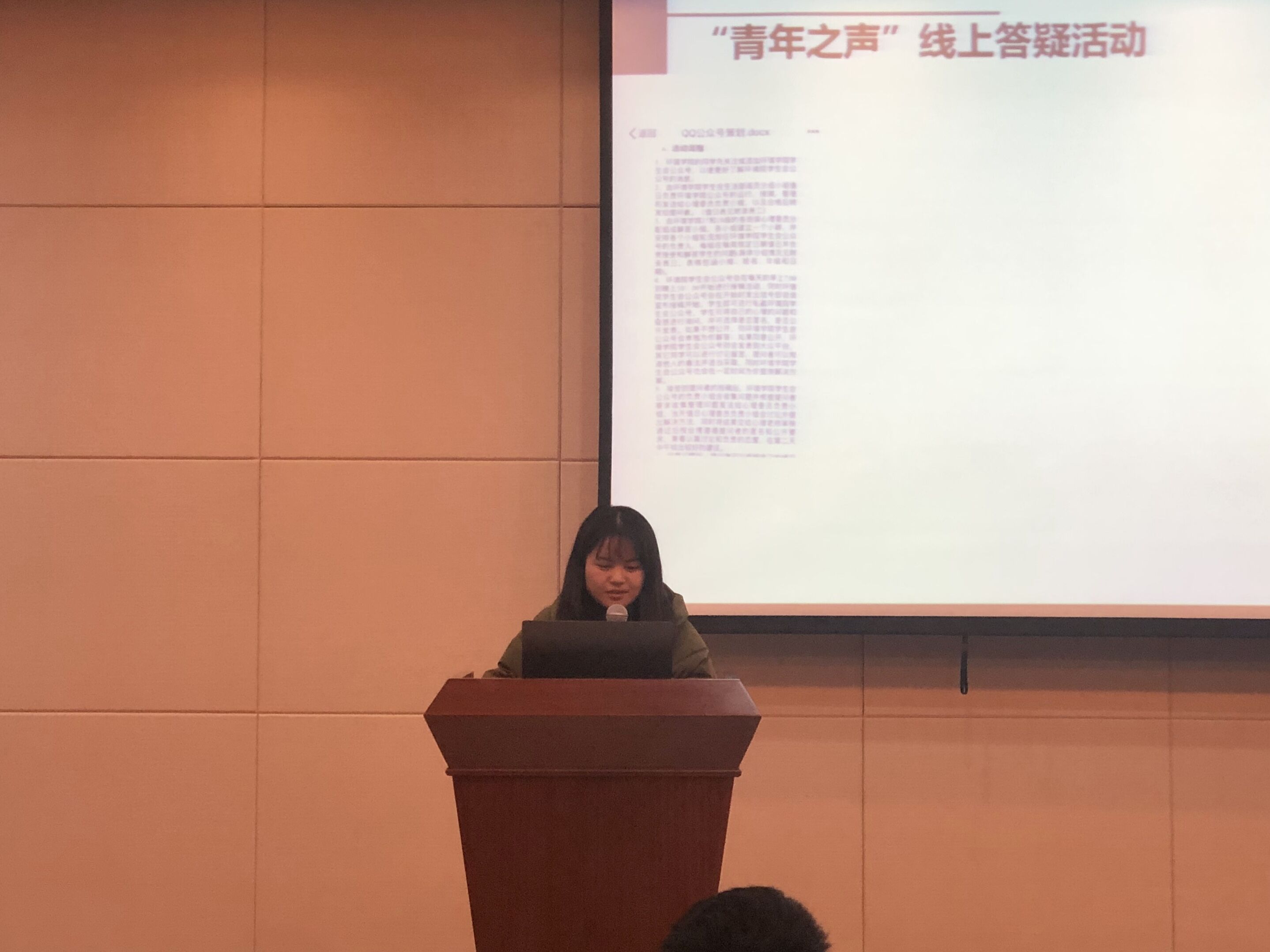 首先进行的是优秀部门的答辩环节,来自环境院学生会,团委,科协以及新媒体中心的各部门的部长轮流进行答辩。答辩过程中,各部门部长借助他们用心设计制作的PPT为评委和听众们带来了精彩的演讲。他们分别介绍了所属部门的性质与职责,简述了本学期部门所举办的活动并分享了丰厚的部门成果。从活动策划到团结建设,每个部门的辛勤劳动成果都得到了展示,部门的工作热情和凝聚力在答辩内容中也得到了体现。