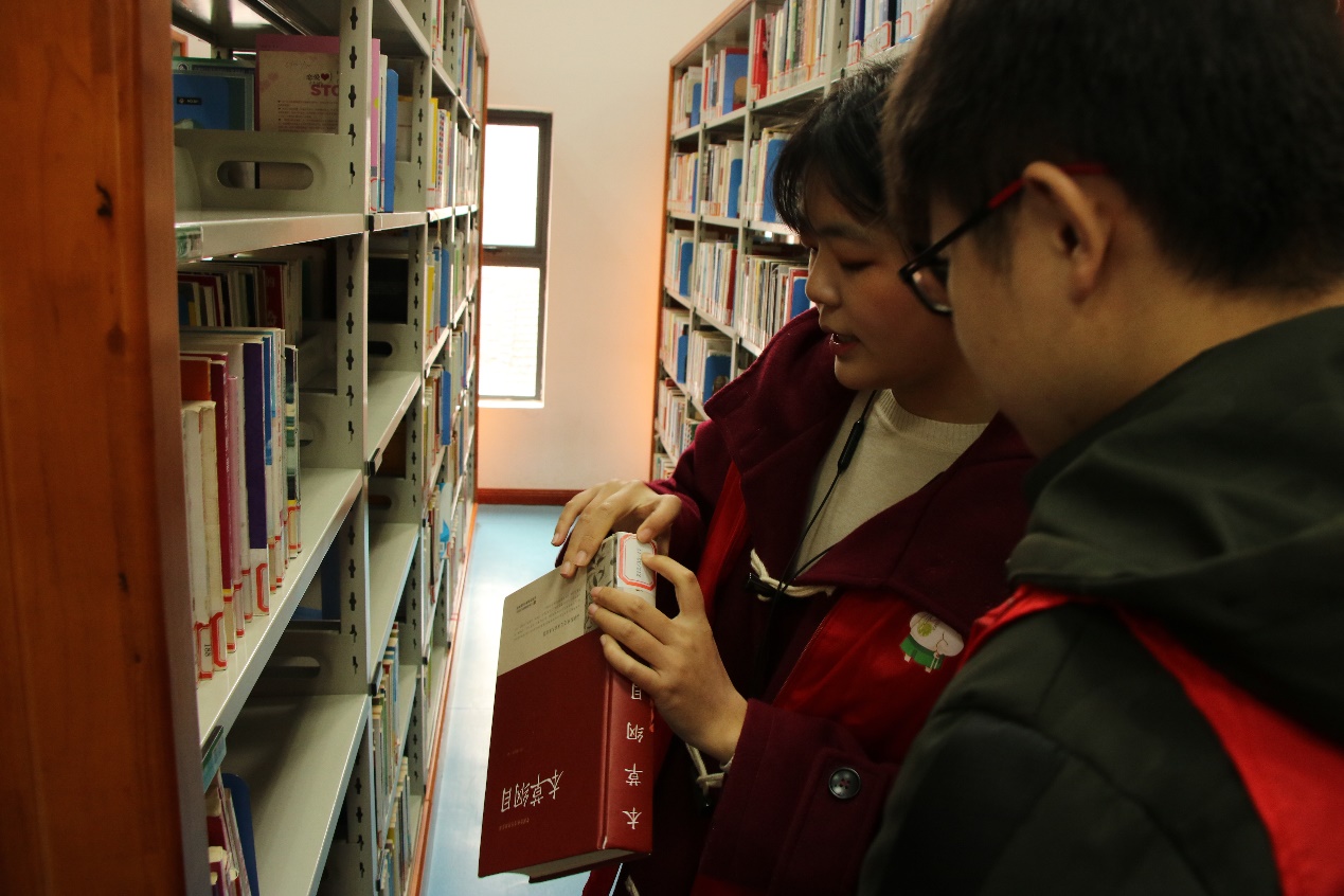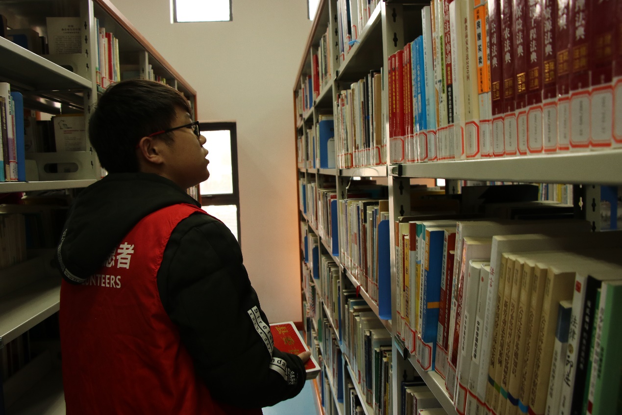 待图书馆工作人员向他们讲述如何“上书”后,他们开始自己动手整理书籍顺序,码齐书刊。志愿者们身着整齐的红色志愿者服装,穿梭在银白书架间,形成一道亮丽的风景线。志愿者们不辞辛苦地整理图书,身上散发出青春的热情与活力。