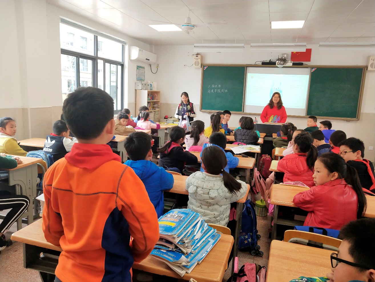中午十二点,志愿者们在学校东门口集合,一起乘坐地铁到达了百家湖小学。来时正好赶上小朋友们快下课,故而志愿者们稍作等待便投入到工作之中。王普负责u盘的拷贝和主持宣讲,李雪儿同学帮忙联系老师和给小朋友们颁发奖品,胡可欣同学则负责为大家安排事宜把握活动流程和时间,一切井然有序。