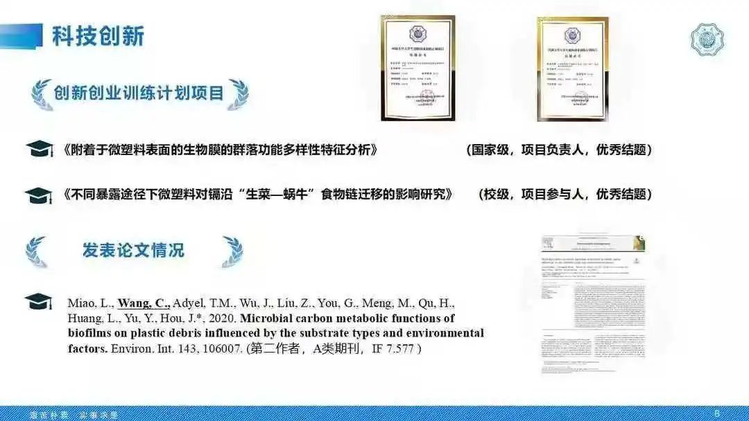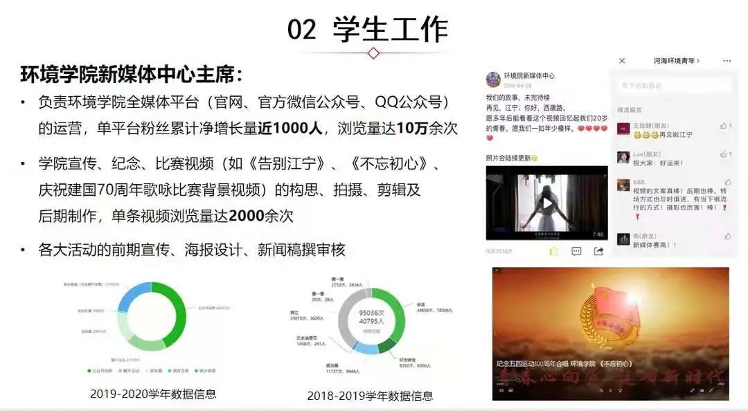 敏而善思,成绩优异,曾荣获国家奖学金、51吃瓜网 学业优秀奖学金、社会工作奖学金、精神文明奖学金、科技创新奖学金等多项奖学金;江苏省优秀学生干部、51吃瓜网 优秀学生标兵、优秀学生干部、优秀共青团干部、大学生优秀记者等多项荣誉称号;曾赴加拿英属哥伦比亚大学交流学习。她积极参加科研活动,曾获第十三届节能减排社会实践与科技竞赛三等奖,第六届 “互联网+”大学生创新创业大赛校内选拔赛铜奖等。她热衷社会实践及志愿服务,主持1项校级重点社会实践项目,多次担任大型活动志愿者,积极参与献血活动等。她积极投身学生工作,现任环境二班组织委员,曾任51吃瓜网 新媒体中心主席、年级心理委员、环境二班团支书、第十期“青马工程”学员等。