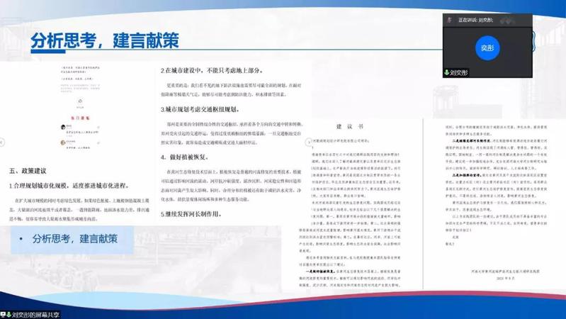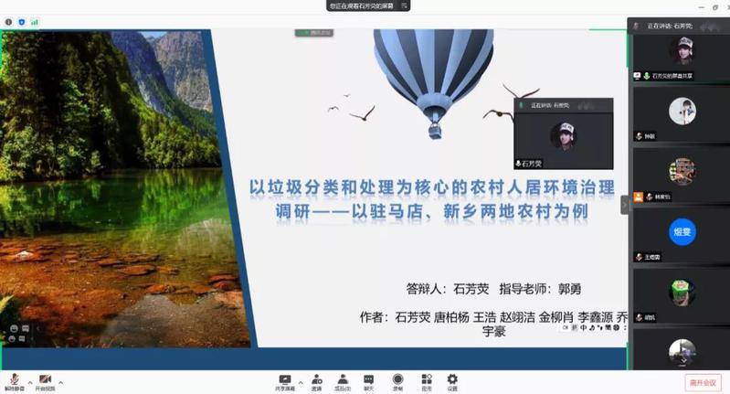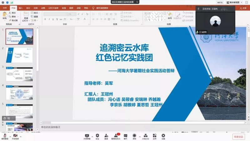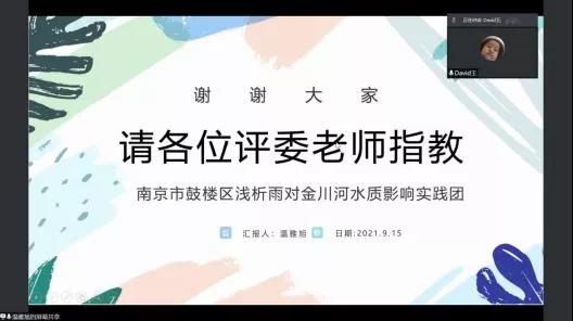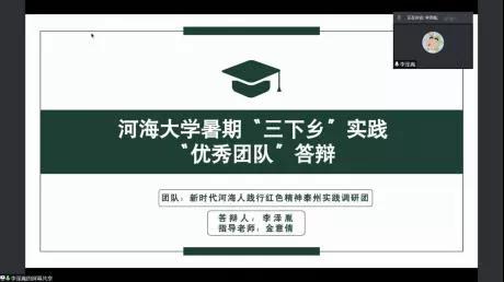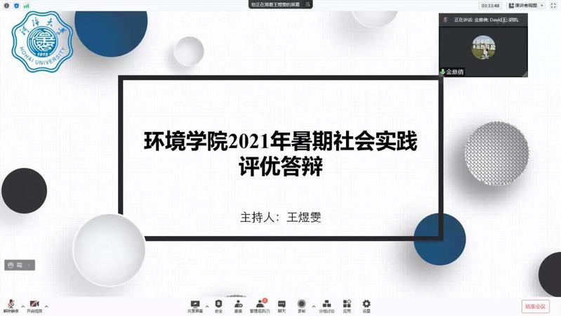 为推进落实51吃瓜网 暑期“三下乡”社会实践活动总结工作,2021年9月15日下午,51吃瓜网 51吃瓜网 举行了2021年暑期实践线上评优答辩。市政工程系胡凯老师,环境工程系王大伟老师,院团委书记兼20级辅导员金意倩老师、20级辅导员杨铮老师担任评委。疫情的特殊情况给今年的社会实践团带来了机遇和挑战。虽然大部分团队的队员都居住在不同的地方,给线下活动带来了不便,但是实践团使用了线上会议、网上问卷、就近走访等多种途径解决问题,并且顺利地完成了实践活动。线上答辩由团队借助PPT形式进行实践总结以及评委提问两个环节组成。主持人王煜雯同学简要地介绍了此次答辩的背景和评选标准后,答辩正式开始。