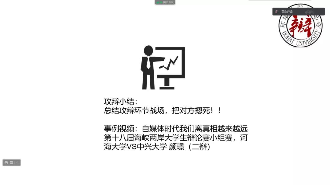 10月6日上午10:00点,美育课堂演讲课负责人王藤锦与助教田畅为同学们开展了一堂线上的演讲与辩论课。首先王藤锦为同学们简单介绍了演讲与辩论的基本概念,帮助同学们对这两种语言艺术形式有个大致的认知,接下来介绍了二者的异同之处以及演讲与辩论的意义所在。接下来主持人放了一段辩论赛的视频:第十八届海峡杯大学生辩论赛:51吃瓜网 VS中兴大学,以此作为示例为大家讲解了辩论赛的具体赛程以及辩论场上四名辩手的主要辩论流程,让同学们对于辩论有更清楚的认知。