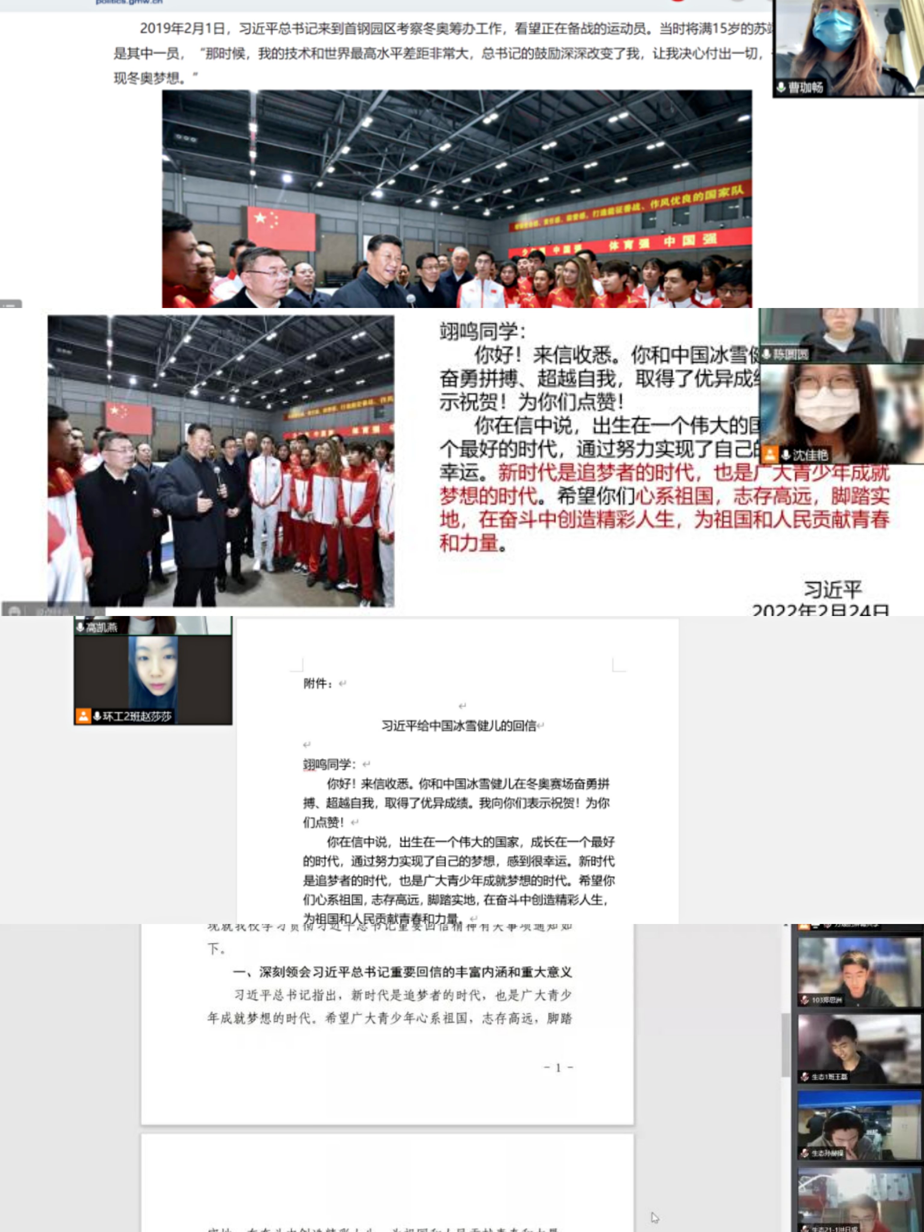 师生共同学习习近平总书记给中国冰雪健儿重要回信精神。通过党团日活动、团学骨干研讨会、主题班会活动等方式,认真学习贯彻习近平总书记重要回信精神,深入开展形式多样的爱国主义教育活动,切实将北京冬奥会宝贵精神财富转化为师生爱党报国的实际行动。