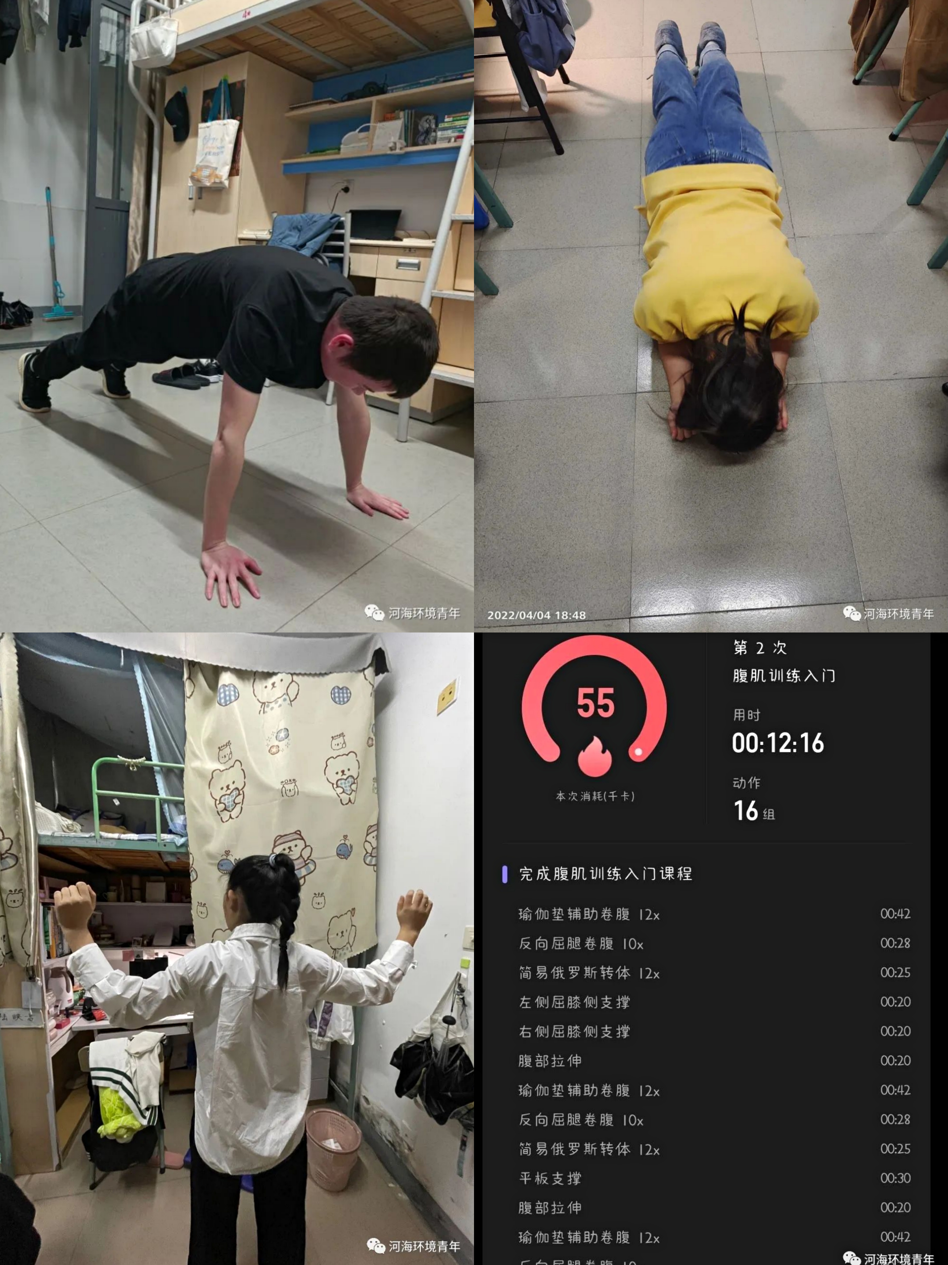 把寝室当作自己的小小健身房。正所谓生命的意义来源于运动,只要内心渴望,没有什么能阻挡我们对运动的向往。”一位参与活动的同学这样感慨。在打卡的过程中,同学们的热情没有因为疫情而减少,他们大胆尝试多种多样的运动类型,做俯卧撑,锻炼上肢力量;跟做帕梅拉,进行减脂燃脂的训练;做瑜伽,健身塑形的同时修生养性……他们在打卡群里积极上传自己的运动照片,带动了热烈的运动氛围,展现出水之子的运动风采。