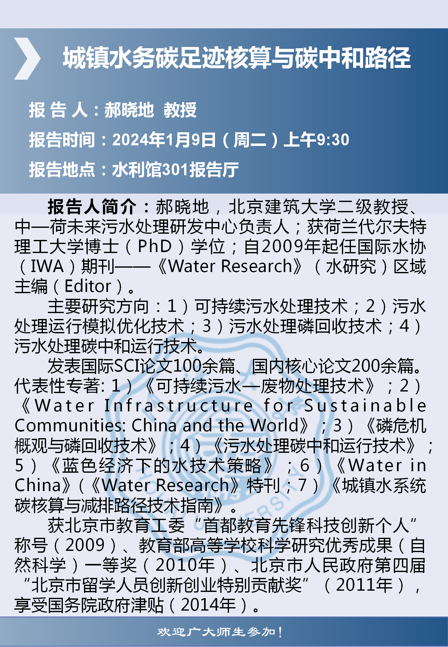 两山讲堂学术报告:城镇水务碳足迹核算与碳中和路径