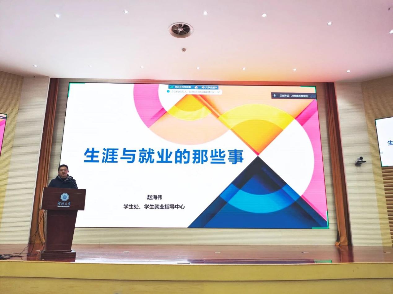 为强化学生生涯规划意识,明确今后自身职业目标,提高学生就业能力和竞争力,1月8日下午,学院邀请了校党委学生工作部副部长、学生工作处副处长、就业指导中心主任赵海伟老师为2021级本科生进行生涯规划与就业指导专题讲座,学院近300名同学参加了本次讲座。