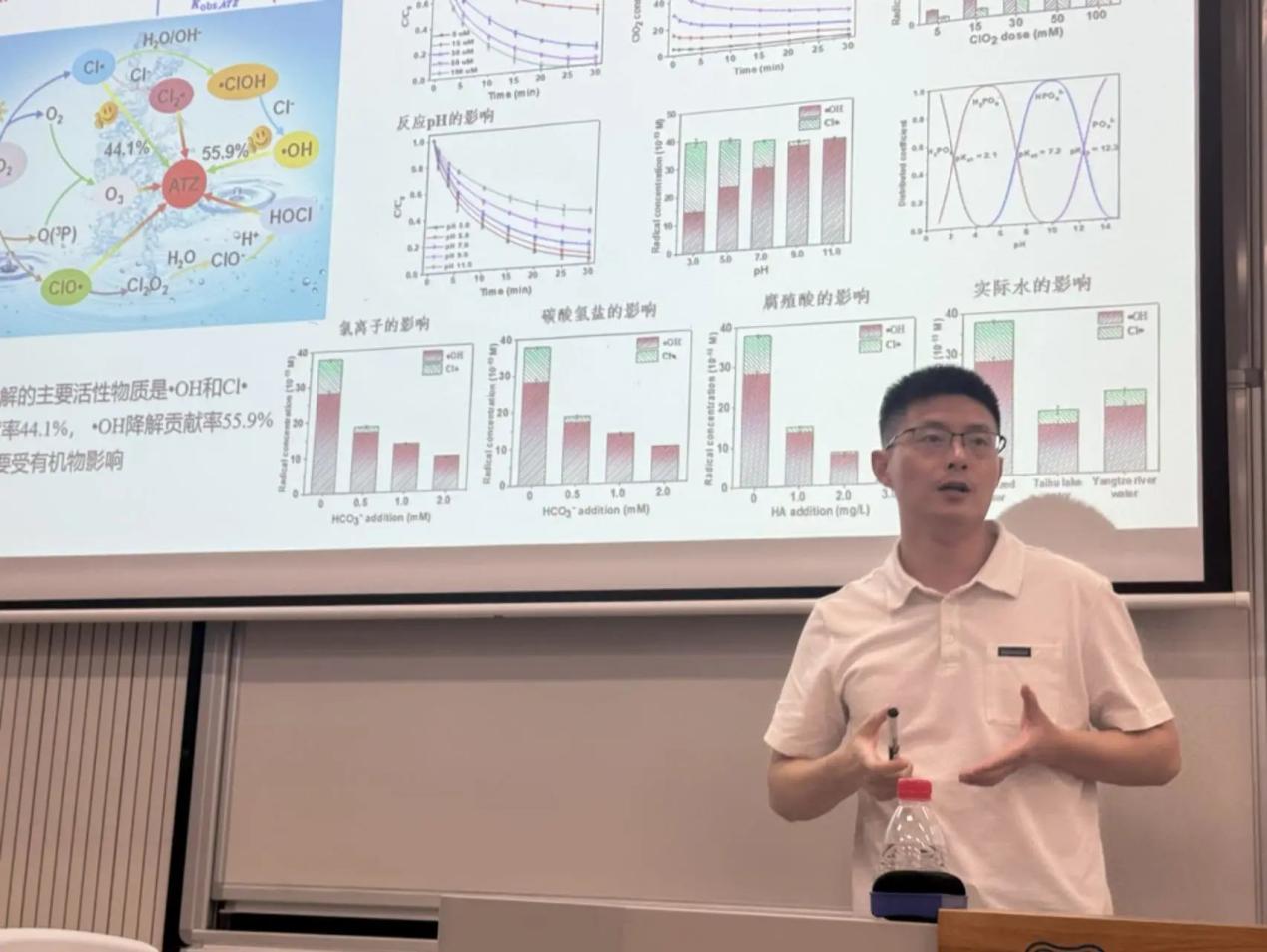 基于实际问题,陈老师所在团队围绕新污染物的特性,从新污染物的降解路径出发,研发了“亚硫酸盐高级氧化”与“太阳光协同二氧化氯消毒”技术,精准对新污染物的每一个路径实施拦截,显著降低处理能耗及次生风险,相关成果有着广阔的应用前景,并已成功应用于宁波某污水处理厂。